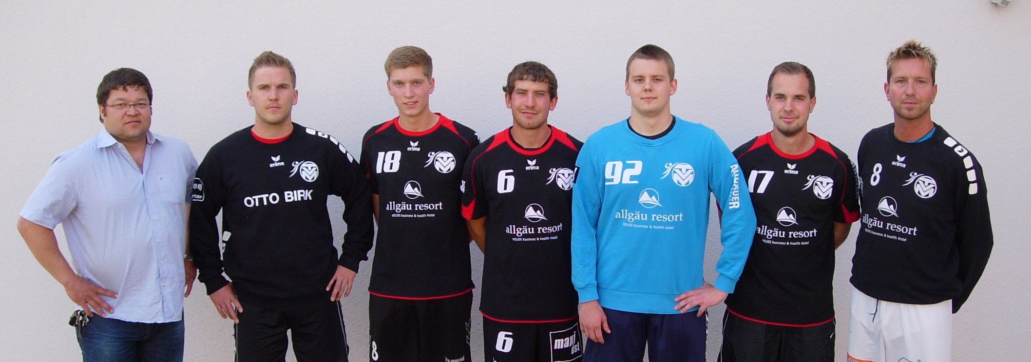 Abteilungsleiter Thorsten Bratz (ganz rechts) und Trainer Thomas Kinkel (ganz links) begrüßen ihre Neuzugänge für die Landesliga-Saison 2013/2014 (von links nach rechts): Co-Trainer Thomas Kohler (HSG Dietmannsried-Altusried), Fabi Wiblishauser (HSG Dietmannsried-Altusried), Phillipp Dündar (TSV Ottobeuren), Max Lehmann und Max Zierke (beide aus der Herren II aufgerückt)